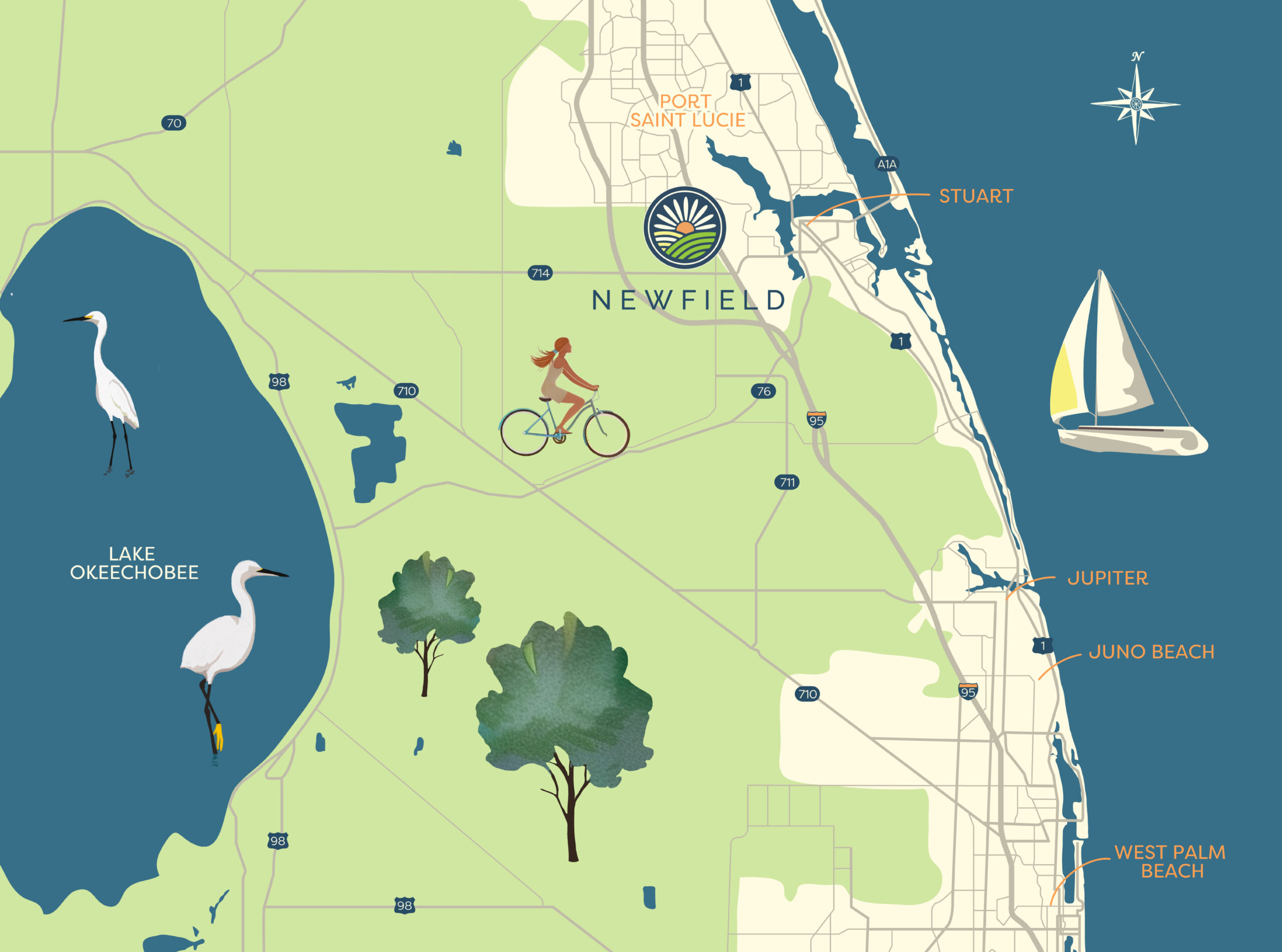 Embracing a fresh perspective on community living, Newfield brings everything within walking distance – from the lively town center and scenic pedestrian, biking and horseback trails to the 170-acre sustainable farm that actively serves the neighborhood. The quaint streetscapes lined with front porches and filled with laughter, coupled with the surrounding natural beauty defines this unique place.